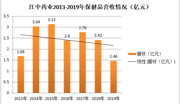 2014-2019年,保健品业务的营收分别为3.04亿元、3.13亿元、2.4亿元、2.76亿元、2.42亿元、1.46亿元,毛利率从2011年的75.02%下滑至2019年的46.06%。