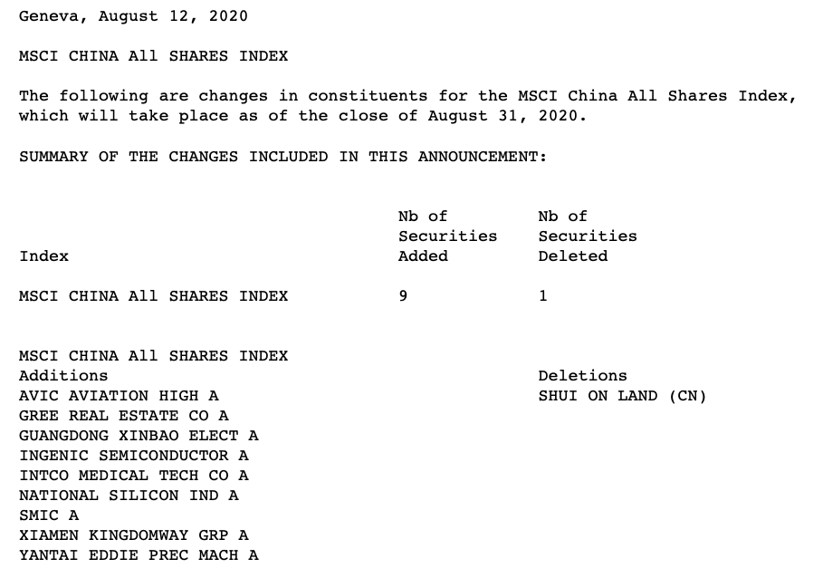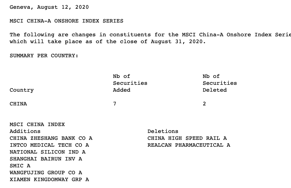 北京时间8月13日凌晨,MSCI公布了8月指数审查结果,对包括MSCI全球标准指数、MSCI全球小型股指数、MSCI中国A股指数等在内的多个指数进行了调整,相关指数变动将会在8月31日收盘后实施,并于 9 月 1 日正式生效。