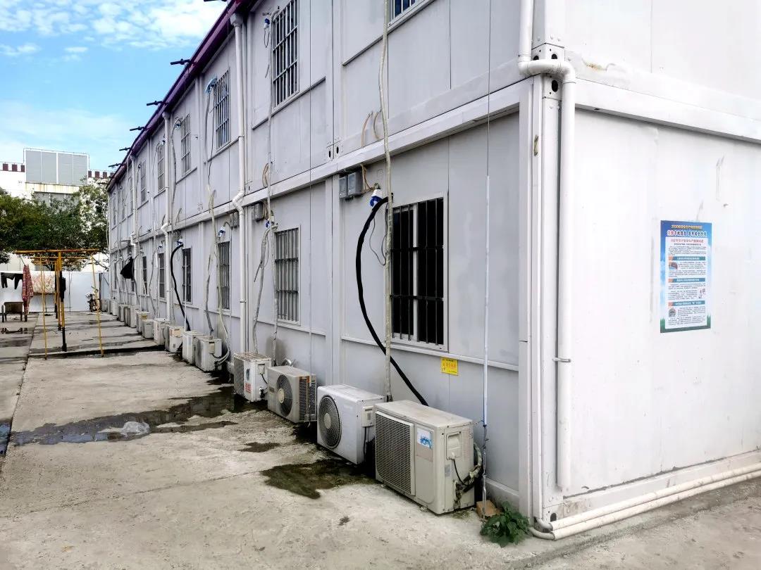 工人们的生活区也配备了淋浴房、厕所,食堂及三人一间的员工宿舍都装有空调、风扇。