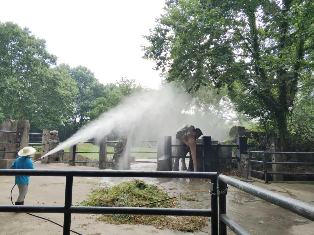 水枪喷出的水雾让脾气暴躁的亚洲象也安静了下来。