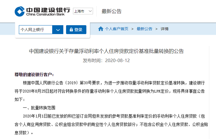 7月20日,交通银行已发布公告,将于2020年8月21日对尚未转换为贷款市场报价利率(LPR)或固定利率的存量浮动利率房贷,按照规则统一调整为LPR浮动利率加减点方式。