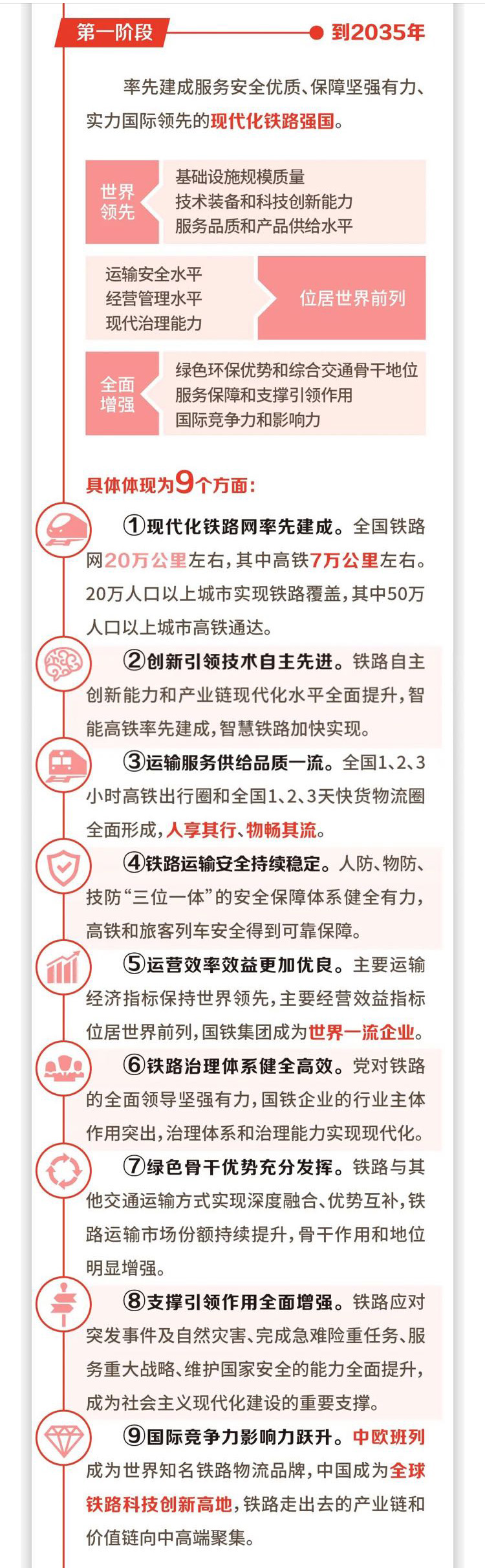 《规划纲要》对标国际先进标准水平,着眼加快推动铁路高质量发展和变革,将全面打造世界一流的铁路设施网络、技术装备、服务供给、安全水平、经营管理和治理水平,把中国建成现代化铁路强国。
