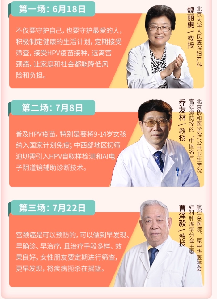 6月18日、7月8日、7月22日,公益计划分别发起了3场公益科普直播,在华医智库医学中心和医促会妇产科专业委员会两个直播平台,邀请到北京大学人民医院妇产科魏丽惠教授 、北京协和医学院/公共卫生学院乔友林教授 、航空总医院/原中华医学会妇科肿瘤学分会主委曹泽毅教授,3位妇产科领域顶级专家分别和观众分享了适合中国人的宫颈癌防控策略、HPV检测+HPV疫苗的双重防护、和宫颈癌治疗的方方面面。三位专家共同呼吁:宫颈癌是可防可控的,可以做到早预防、早发现、早治疗,且治疗手段多样、效果良好,所以女性朋友要定期进行筛查、接种HPV疫苗,远离宫颈癌,让家庭和社会都能降低风险和负担;同时提到近年来异军突起的HPV自取样检测,用户在家即可自行取样,私密便捷,大大提高了宫颈癌筛查的覆盖率,减轻了医疗人员的负担。