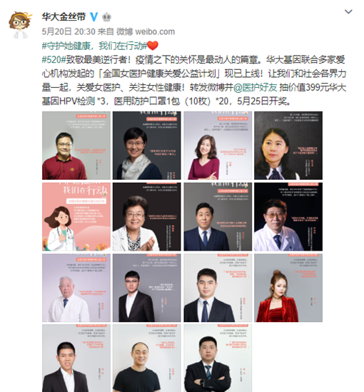 为致敬“她力量”,守护“她健康”,华大基因联合中国女医师协会、中国民族卫生协会、中国健康促进基金会、企鹅杏仁集团、猛犸基金会及关注女性健康的社会爱心企业共同发起“全国女医护健康关爱公益计划”,通过女性健康关怀礼包公益捐赠、健康知识公益直播等系列活动,关爱女医护人员的身心健康,并与医生专家共同呼吁全社会关注女医护、关注女性健康,传递爱与希望。