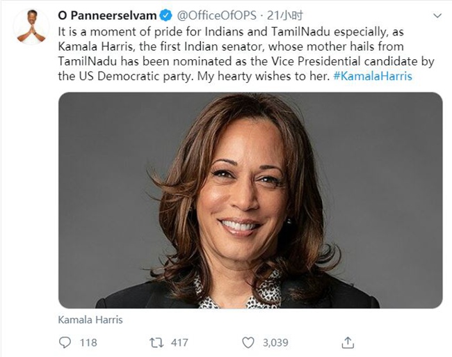 目前,哈里斯赢得了印度民间的热烈支持。哈里斯的母亲来自印度泰米尔纳德邦,当地官员把哈里斯成为拜登的搭档赞为“印度和泰米尔纳德的骄傲”。