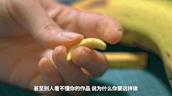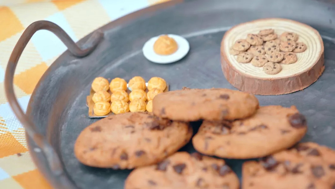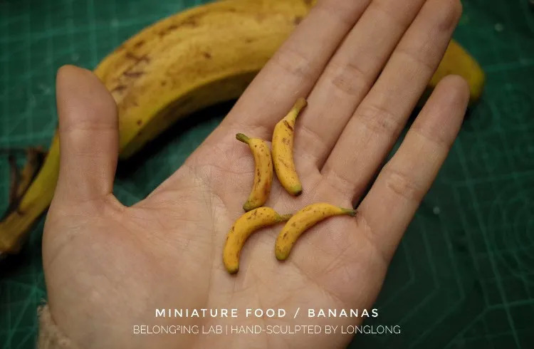 关于食物的日常百态总能给我灵感。有时候我买了一包趣多多饼干,突然想让房间里的玩具娃娃也拥有一份微缩版;路过水果摊,买一根香蕉,我从早拍到晚,从外皮观察到果肉,用黏土把它“临摹”一遍。