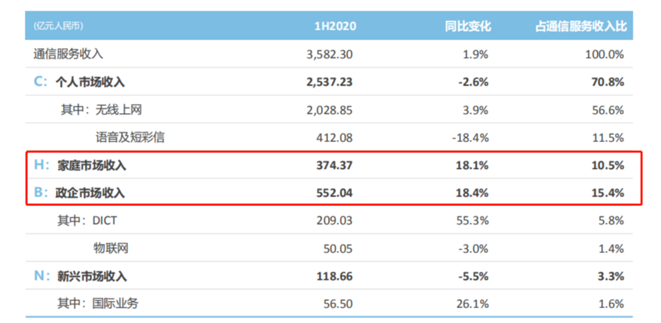 从中国移动财报收入结构上看,2020年上半年,个人市场营收为2,537.23亿元,同比下降2.6%;其余非个人市场同比上升15%,家庭市场、政企市场提升较多,5G在行业场景逐步商业化落地。