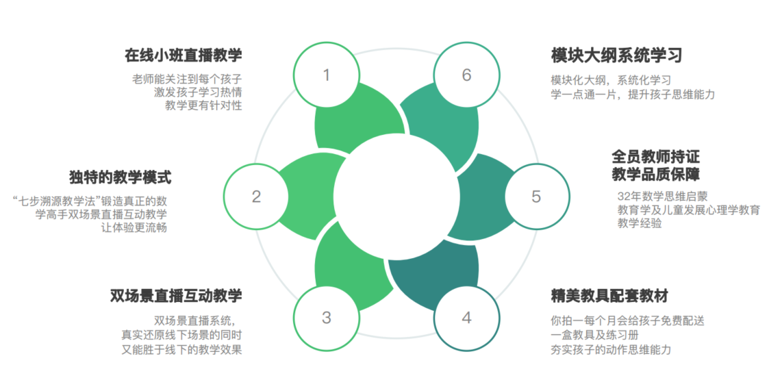 从内容层面看,该公司目前的产品体系是以在线直播课为核心,覆盖从幼儿园到小学五年级这八个年级段。围绕在线直播课,周边环绕多个与数学思维相关的轻产品和短期课。