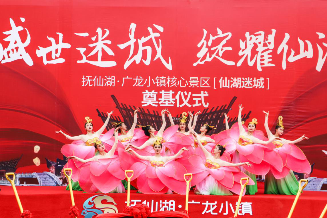 上午09点40分左右,伴随着一段极具轻柔飘逸的《荷花舞》表演,核心景区仙湖迷城奠基仪式的帷幕正式拉开。