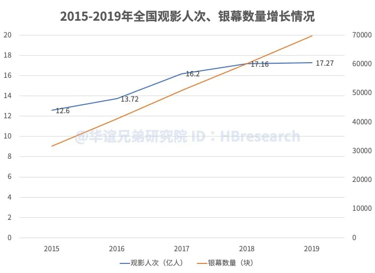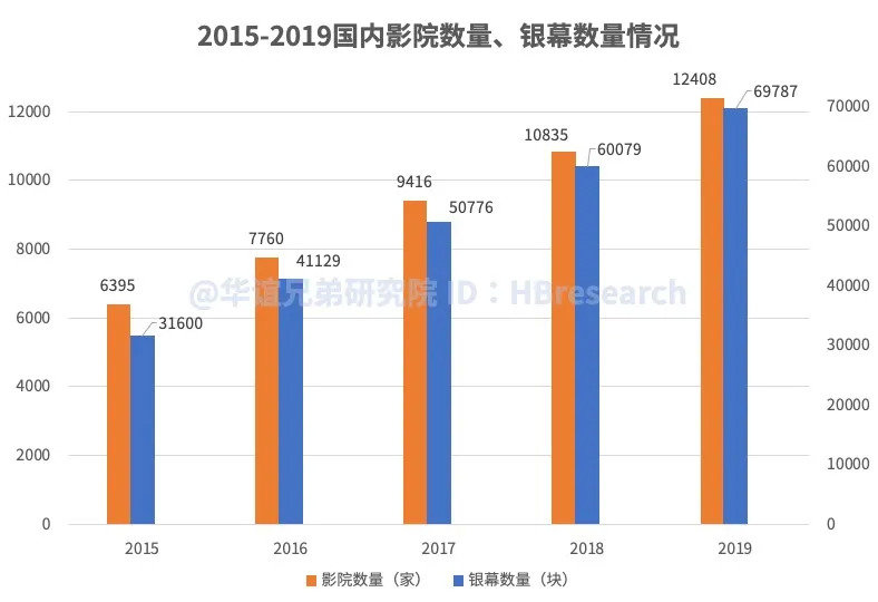 从2015年到2019年,国家电影专资办统计,全国影院数量从6395家影院增长至12408家,每年呈现正增长趋势。数据显示,2019年全国影院数量是2015年的2倍。随着影院数量的增加,我国电影院银幕数也不断增加,从2015年的全国31600块银幕增长至2019年的69787块,平均增长率为22%。