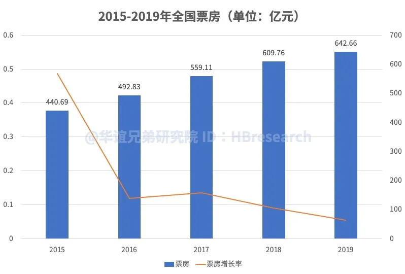由于观影人次增长较慢,票房增速也逐年缓慢。从以上图表可以看出,2016年、2018年、2019年,票房增长率相较于上一年都有明显下降。