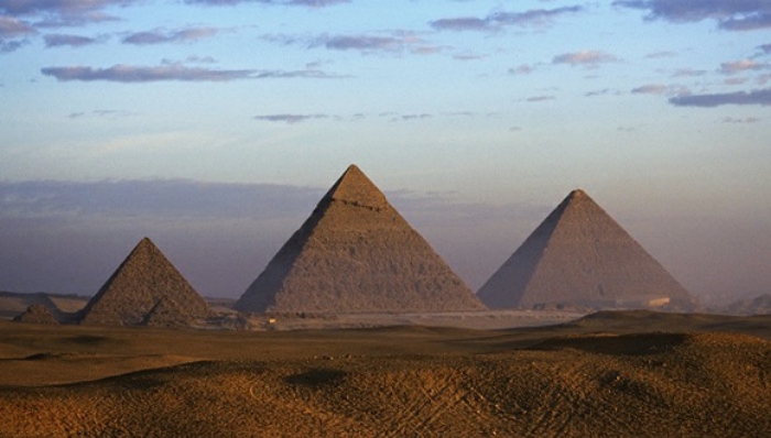 除了胡夫金字塔,另外两座巨大的金字塔也屹立在吉萨城中,一座是胡夫之子海夫拉法老的陵墓(原高达471英尺),另一座是海夫拉之子门卡乌拉法老的陵墓(原高达218英尺)。海夫拉金字塔的剩余石材被用以雕塑成大名鼎鼎的狮身人面像,约241英尺长、66英尺高。这三座金字塔都曾遭盗墓贼的光顾,塔身外部的白色石灰岩大量遭窃,或许被偷去用作其它建筑的材料。