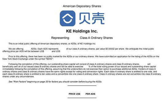 8月8日,贝壳找房在美国SEC更新招股书。招股书显示,贝壳找房发行价在17美元-19美元之间,预计募集资金总额约18.41亿美元-21.19亿美元,共计将发行1.06亿股ADS。