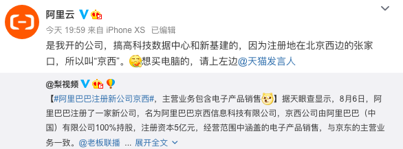 8月13日晚间,阿里云计算官方微博回应称:“是我开的公司,搞高科技数据中心和新基建的,因为注册地在北京西边的张家口,所以叫‘京西’。想买电脑的,请上左边@天猫发言人。”
