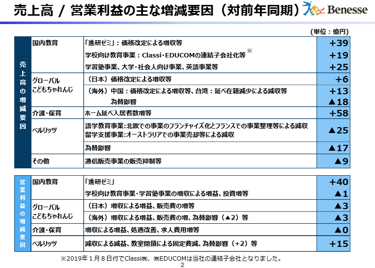 贝内斯称介护 保育部门的营业额同比上一年增长的主要原因在于入住养老院的总人数增加,而营业利润略有减少则是由于虽然收入增加导致利润增加,但同时因实施待遇改善、人工费增长等方面的影响而最终导致的结果。