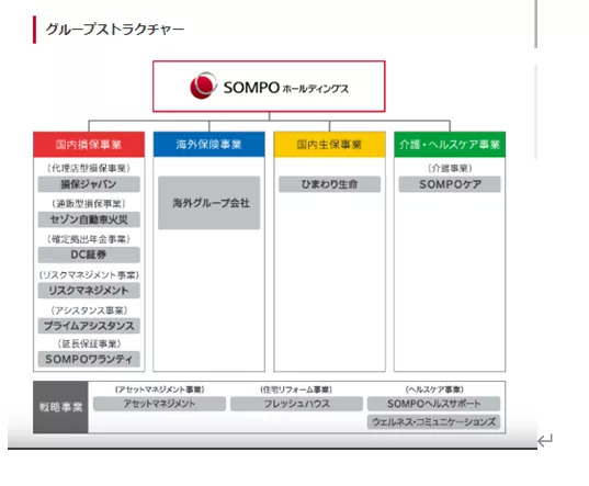 业务类别:除国内损保、海外保险、国内生保、介护 保健等核心业务之外,还开展了资产管理和住房改造等战略性业务。其中,损保旗下集团公司SOMPO Care主营损保集团的介护 保健业务。