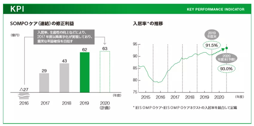 2019-2020年,损保提出进一步提高生产性、扩大周边业务的收益,在认知症照护上构建强大的SOMPO品牌。2019年,SOMPO Care住宅系服务的入住率为91.5%,虽然未达到年初计划,但通过提高生产性和削减成本等措施,修订利润达到62亿日元,最终超过年初计划水平。
