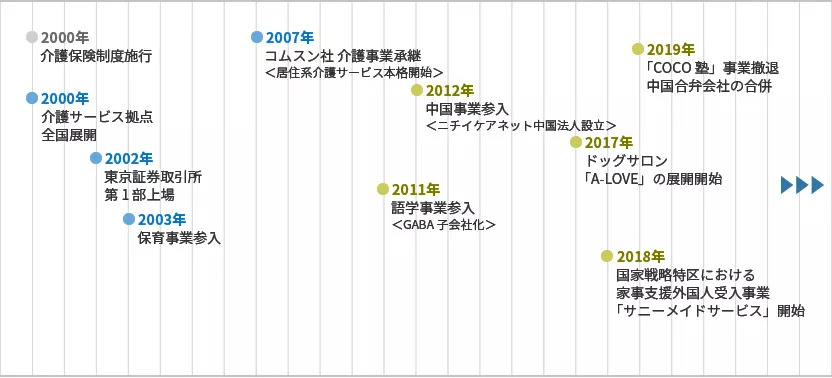 介护业务发展历程:日医作为介护行业龙头企业,于1996年4月开始加入介护业务。2000年4月,伴随着介护保险制度施行,日医在全国开设了770所介护服务据点,正式开展起介护业务。2004年12月开始家务代理服务,2007年11月从大型上门介护公司股份有限公司komusunn承继设施介护业务,由此正式开始住宅型介护服务。2012年2月股份有限公司Nichii Care Net在中国设立法人,由此开始经营在中国的事业。2013年12月成立中国现地法人日医(北京)商贸有限公司(现日医(北京)居家养老服务有限公司)。2016年将开展访问介护和日间照护服务的股份有限公司Odakyu Life Asoshia纳为子公司,2019年承继股份有限公司Hankyu Bus的介护业务等,开展了各种介护业务,拓宽了沿线所提供的服务。
