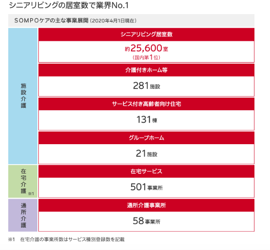 经营指标:截至2020年4月,SOMPO Care经营的养老设施业务包含281家护理疗养院、131栋老年人服务性住宅和21家集体康复之家(GroupHome),老年居室总计约达25600间,在日本国内高居榜首。除养老设施业务之外,所提供的居家护理服务事务所达501家,提供上门护理的事务所为58家。