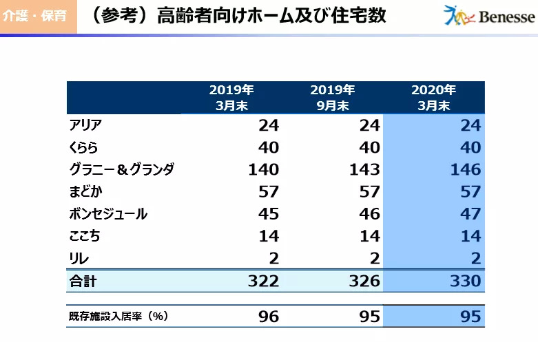2019年4月,贝内斯陆续开展各类价格区间的收费养老院,到2020年4月,面向高龄者的养老院(付费养老院、服务性老人住房等)达330所,居家介护业务据点达40处(其中,介护中心34所、日间照护中心6所)。