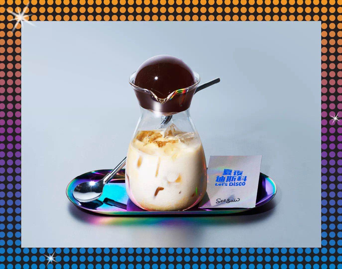 Seesaw的Affogato,冰淇淋是太妃糖口味的,堂食比打包带走更好吃(当然大多数Affogato都是这样)。此外他们还有一些常规咖啡之外的夏季甜品:最有趣的是一款叫“蹦迪波波球”的咖啡甜品,百利甜酒冰拿铁基底,里面有一颗用浓缩咖啡做成的圆形咖啡果冻。咖啡果冻被放在细颈瓶的瓶口,你可以自己把它戳碎塞进拿铁里,和Affogato的逻辑有异曲同工之处。
