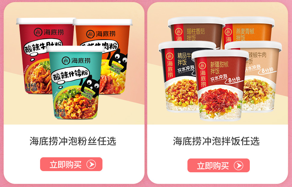除了快餐品牌的打造,海底捞便推出了各种各样的方便食品,如特色自煮火锅套餐,以及最近新上线的冲泡米饭和方便酸辣粉,很好的完善了线上渠道的产品种类。