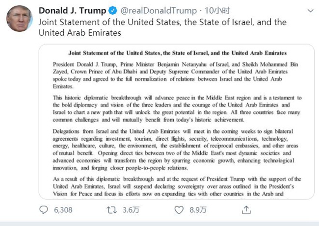 和以往的操作一样,阿联酋和以色列取得的“历史性突破”最早是由特朗普在Twitter上公布的。