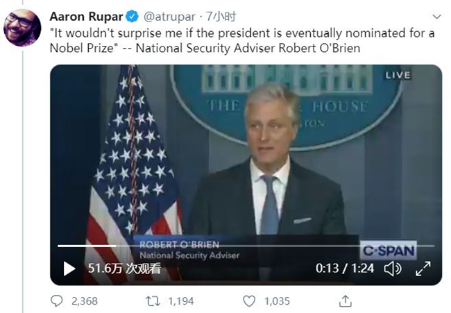 奥布莱恩则盛赞特朗普的谈判技能,“非常厉害的谈判能手”,“历史会记住总统是一名伟大的和平缔造者”,“回看总统在和平问题上做出的贡献,如果他获得诺贝尔和平奖提名,我一点都不吃惊。”
