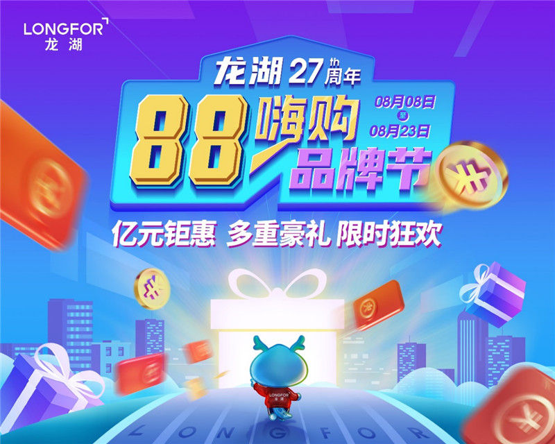 今年8月份,龙湖集团迎来27周年庆,重金打造88嗨购品牌节,全国97折购房优惠回馈新老客户,除此以外,还将有线上冲关砸金蛋,赢取最高288元现金红包,到访抽奖赢取价值1.7万元华为matexs折叠手机/2000元京东E卡/iwatch手表以及龙小湖周边纪念品,更有成交豪礼相送,亿元钜惠,多重豪礼享不停,限时狂欢将于8月8日开启!