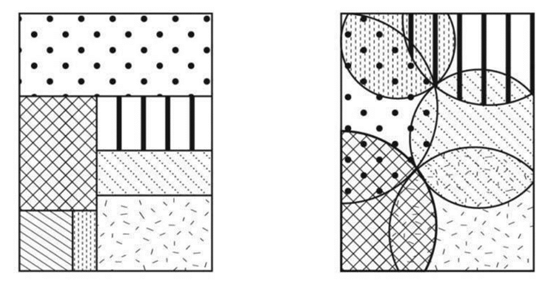 图:MECE VS 非MECE。在MECE的思路下,所分类别之间不存在重合,但合在一起就能覆盖整个概念。