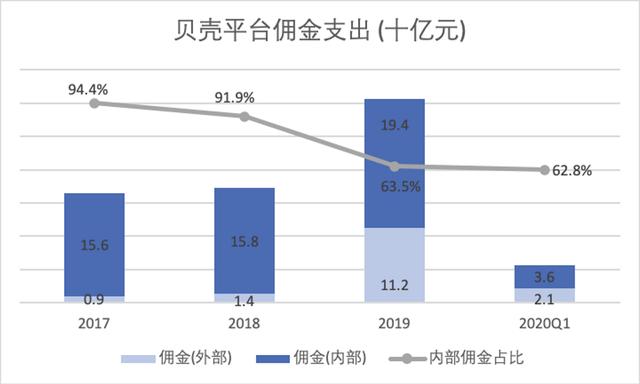 2017年,贝壳平台支付链家旗下的经纪人佣金达156亿、占总佣金支出的94.4%;2019年,链家的经纪人仅获得佣金194亿,占比降至63.5%。