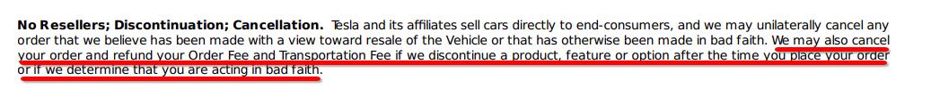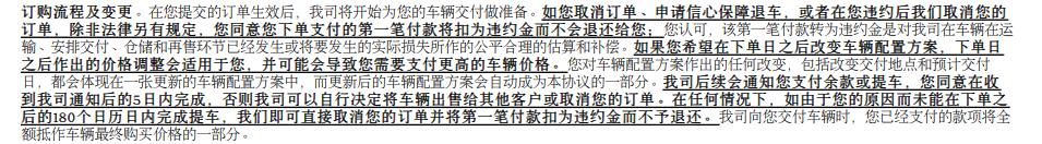 在这一事件中,特斯拉关于"强制取消订单"的规定引发了强烈质疑。在上述规定中,特斯拉表示,"任何我司认为其目的是为了转卖的订单或者有其他非善意目的的订单,我司有权单方面解除协议"。