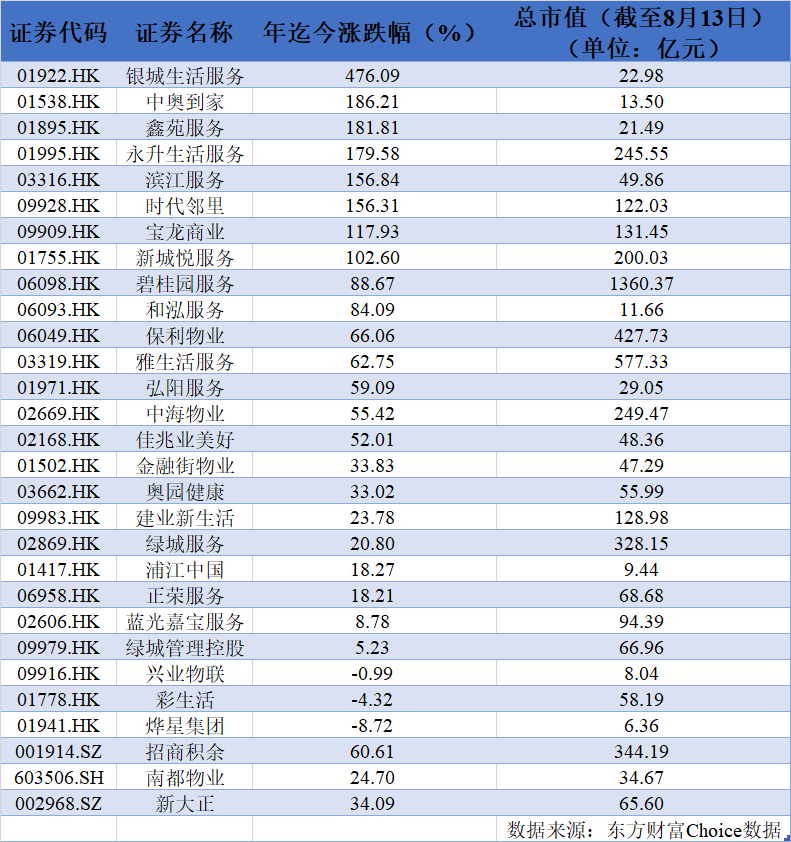 东方财富Choice数据显示,截至8月13日,有8家上市物管企业的股价涨幅超过100%,其中银城生活服务的股价更是暴涨近5倍。
