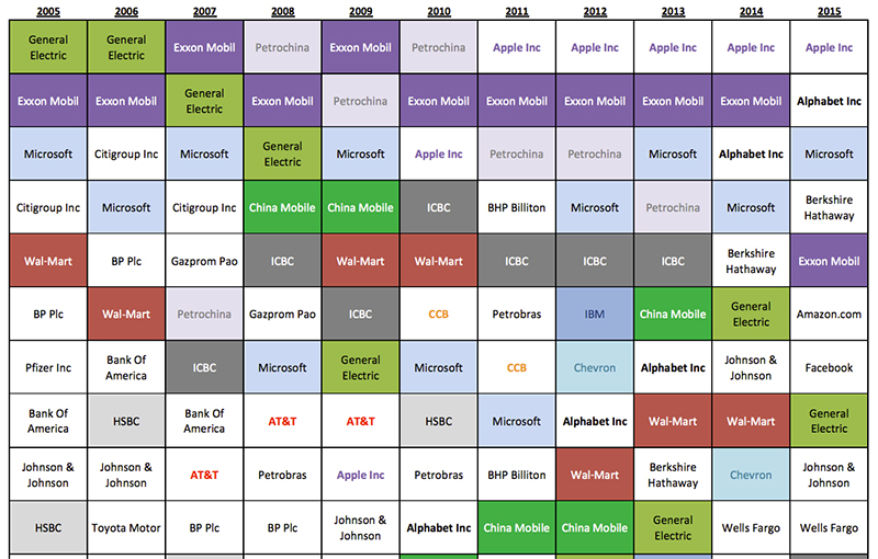 在美国投行高盛发给客户的年末信中有这样一个金融填字游戏,上面是过去10年来全球规模最大的20家公司名单。由于油价低迷导致埃克森美孚跌出前三甲,微软取而代之,2015年首次出现了全球最大的三家公司全是科技公司的情况。