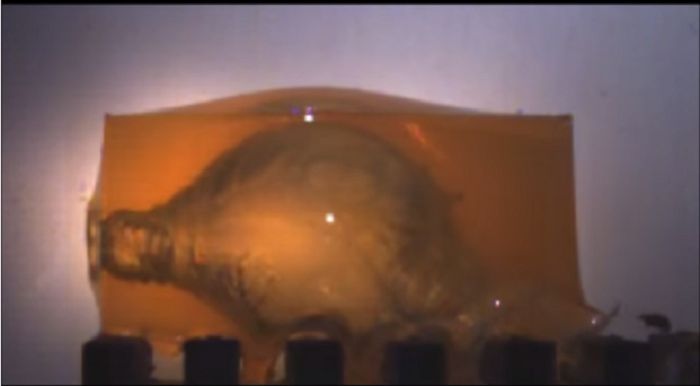以下这张图是M4步枪的5.56毫米子弹射击明胶产生的空腔,这张图可以让医治枪伤的专家评估人体组织在瞬时空腔的压力波下受到了多大的损伤。