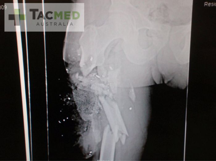 从上面这张照片你可以看出M4步枪的可怕威力,子弹从右臀下方进入并在右侧大腿部造成了巨大的创伤。下面这张X光片显示弹片穿透了大腿骨并将其完全击碎,碎裂的骨头刺进肌肉组织并构成了主要创伤。