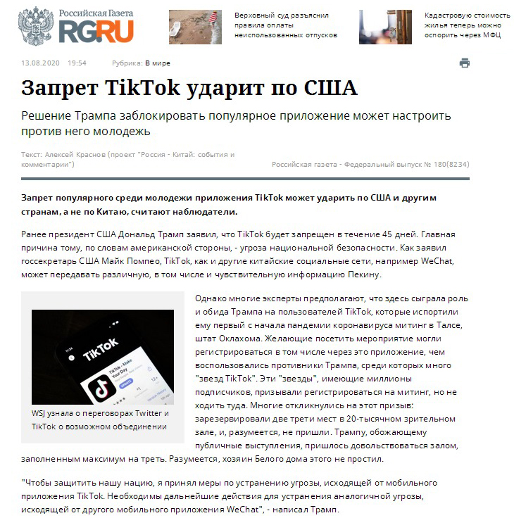 当地时间8月14日出版的《俄罗斯报》在《中俄锐评》专栏中发表题为《美国封禁TikTok将反噬其身》的评论文章。文章指出,美国借口国家安全,发布对中国应用程序TikTok和微信的禁用令,其结果未必能够真正封杀中国企业、抹黑中国形象,反而可能使苹果公司等美国企业遭受损失,损害TikTok和微信在美国用户的现实权益。文章强调,TikTok有可能在美国被强制收购,这不啻为一种强盗行为。