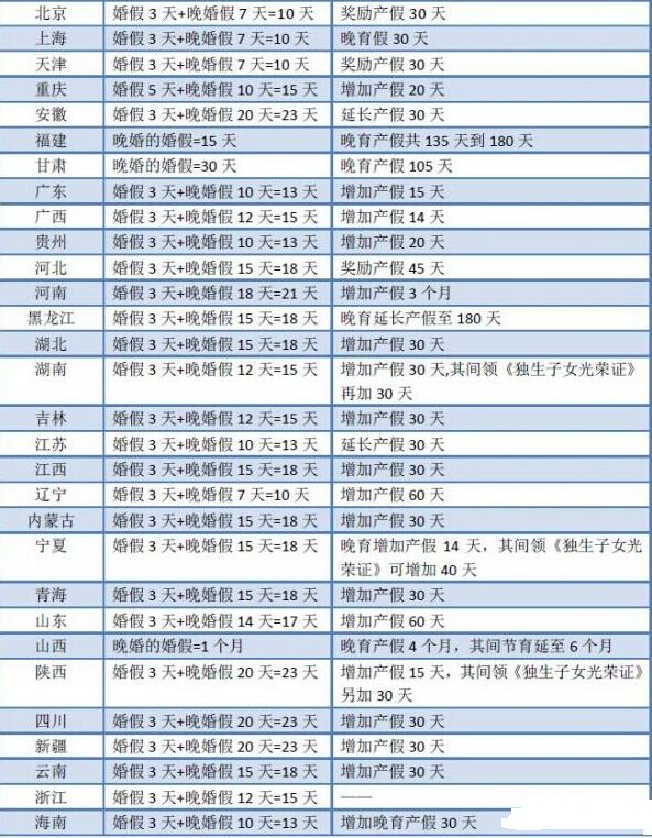 对于晚婚晚育假期的奖励规定,各地在执行全国政策的基础上,又分别有各省自己额外的奖励假期。大家不妨可以看看现有的婚假产假福利表: