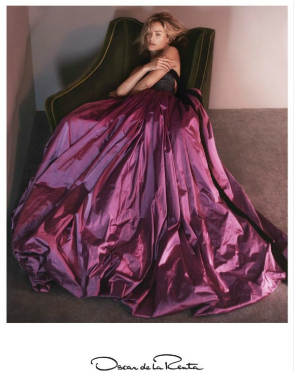 Oscar de la Renta 的创意总监邀请 Carolyn Murphy 出演他的首部广告大片。褶皱式的超大裙摆配上模特无精打采的慵懒神情带出品牌的现代感。