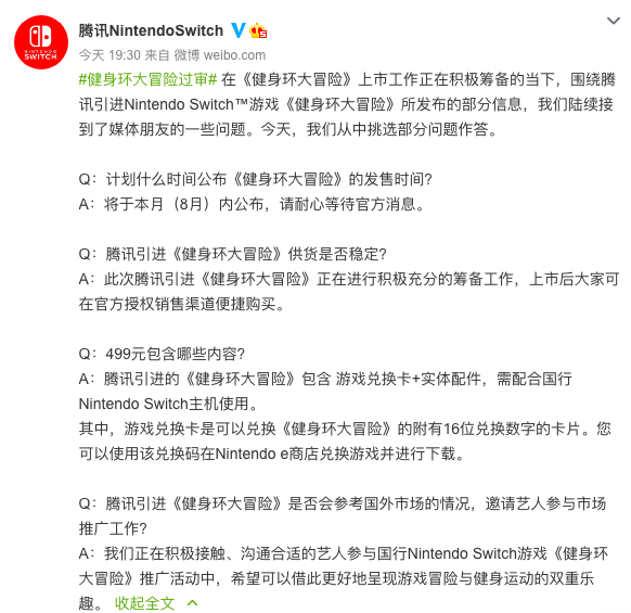 据腾讯Nintendo Switch最新消息,《健身环大冒险》国行发售时间将在8月公布。据了解,腾讯引进的《健身环大冒险》包含游戏兑换卡 + 实体配件,需配合国行Nintendo Switch主机使用。其中,游戏兑换卡是可以兑换《健身环大冒险》的附有16位兑换数字的卡片。您可以使用该兑换码在Nintendo e商店兑换游戏并进行下载。腾讯Switch官方表示,正在积极接触、沟通合适的艺人参与国行Nintendo Switch游戏《健身环大冒险》推广活动中,希望可以借此更好地呈现游戏冒险与健身运动的双重乐趣。