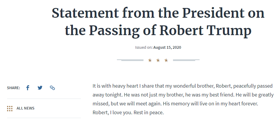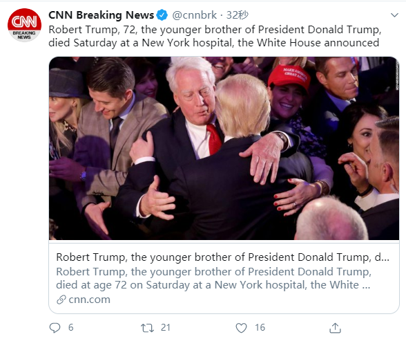 美国有线电视新闻网(CNN)8月16日消息,美国总统特朗普发布声明称,弟弟罗伯特·特朗普周六(15日)在纽约长老会/威尔康奈尔医疗中心病逝,享年71岁。