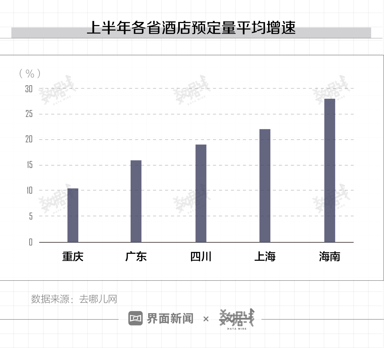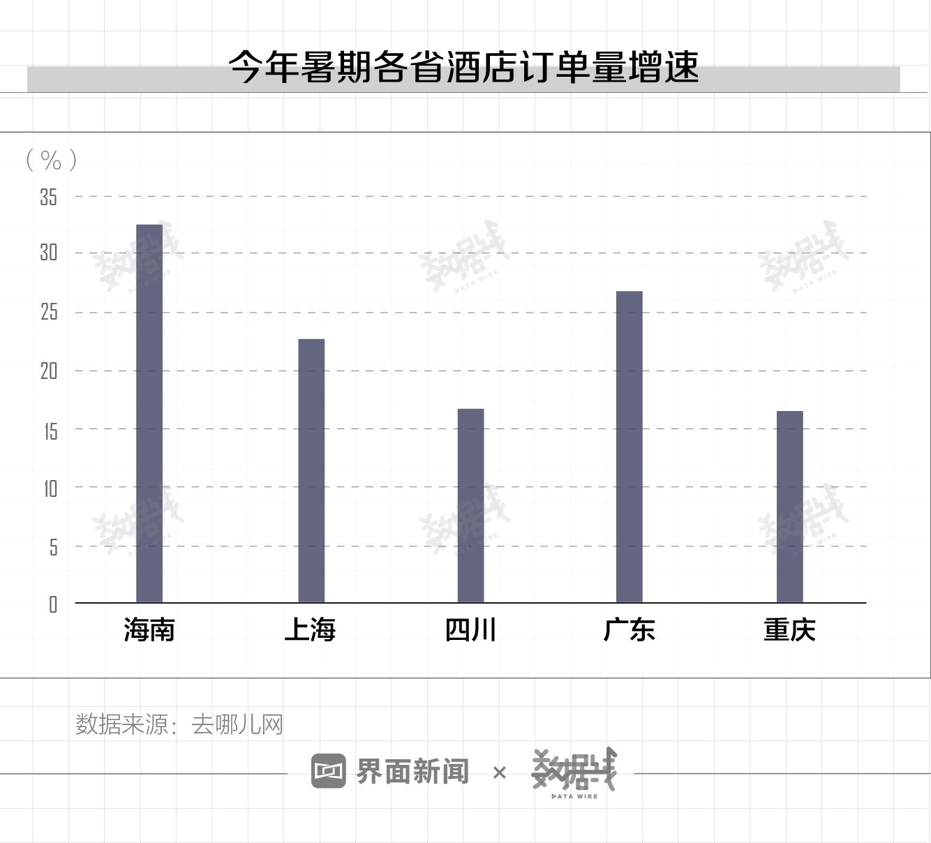 从去哪儿网的各省酒店预订数据来看,今年上半年,在各热门旅游省份当中,海南酒店预定量平均增速达到28.1%,进入暑期以来,海南酒店预订量增幅更是达到了32.4%,远高于其他旅游目的地,上海、四川、重庆成为最大客源地省份。