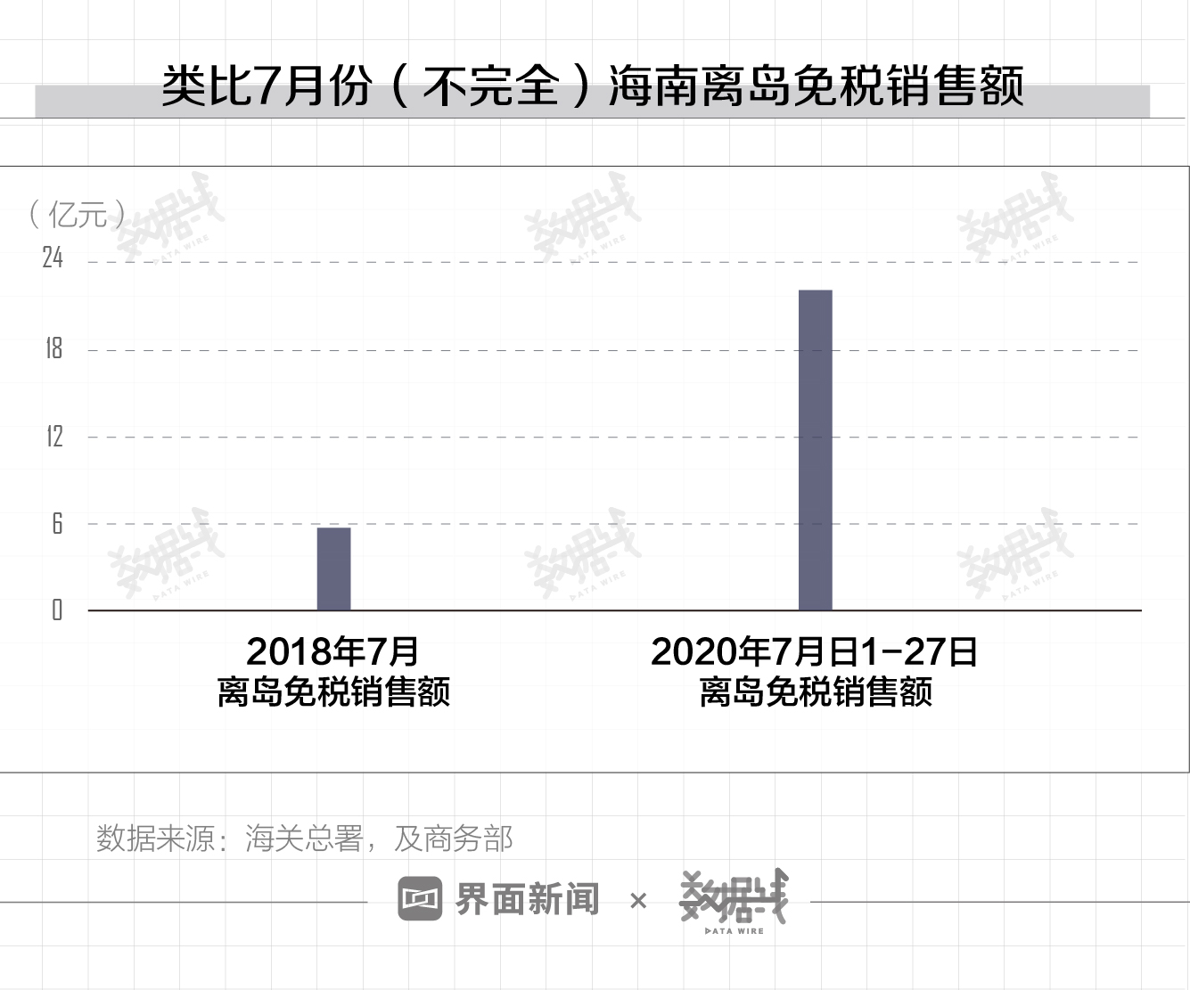 而到今年7月,据海关总署公布的海南离岛免税购物政策成绩单,在7月1日至27日,海关共监管海南离岛免税销售金额22.19亿元、购物旅客28.10万人次,较去年同期分别增长234.19%、42.71%。不满一个月的销售金额,是2018年7月,三亚、海口两家免税店免税商品销售额的近4倍。当然原因除了免税政策调整,也包括免税店的增加。
