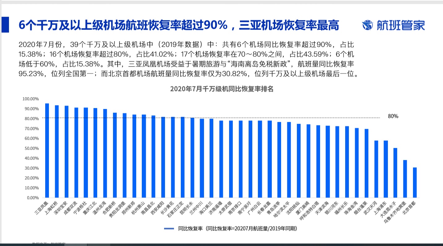 界面新闻从航班管家处获得海南两机场运行数据,2020年7月份千万级以上机场同比恢复率排名中,三亚凤凰机场航班量同比恢复率为95.23%,位列全国第一。飞常准统计数据也显示,7月份三亚凤凰机场飞机起降架次为9284架,进港航班为4644架;海口美兰机场飞机起降架次为10398架,进出港航班达5198架。