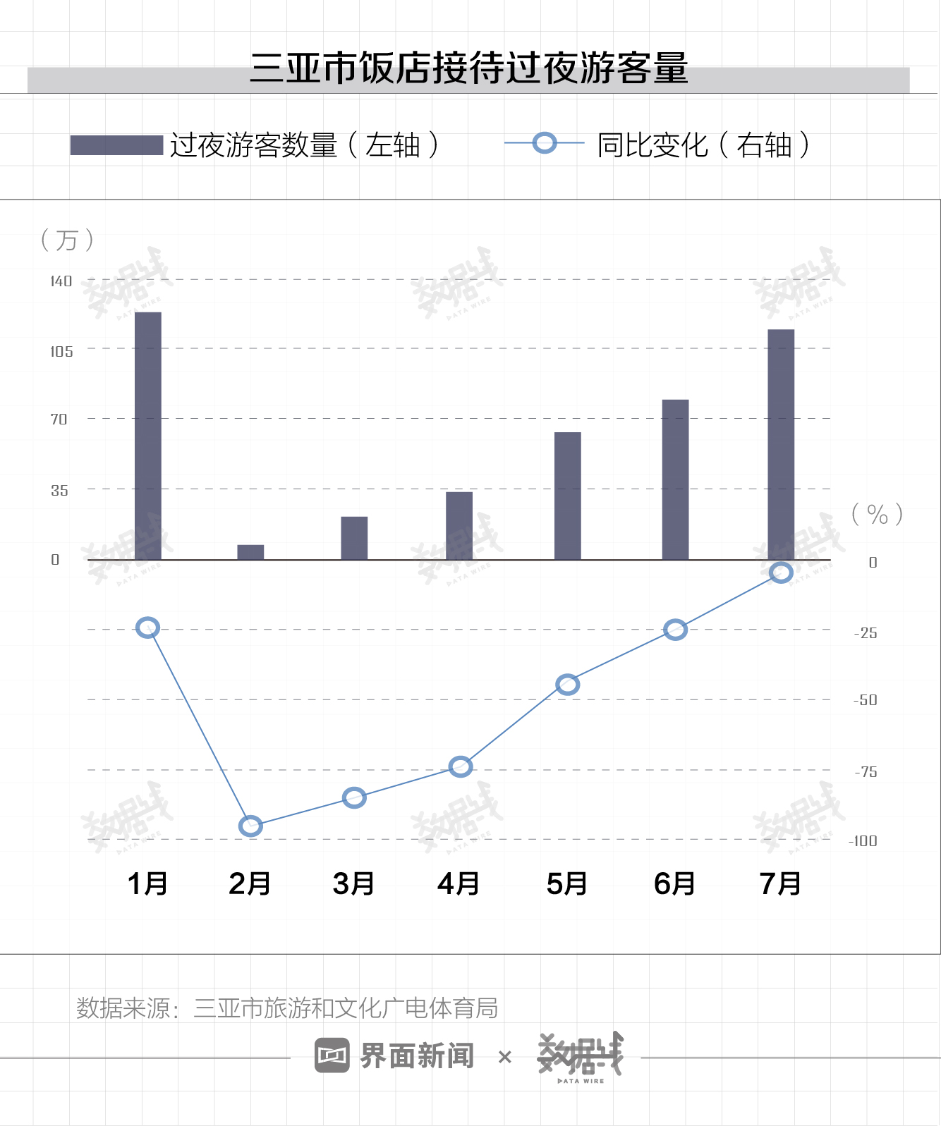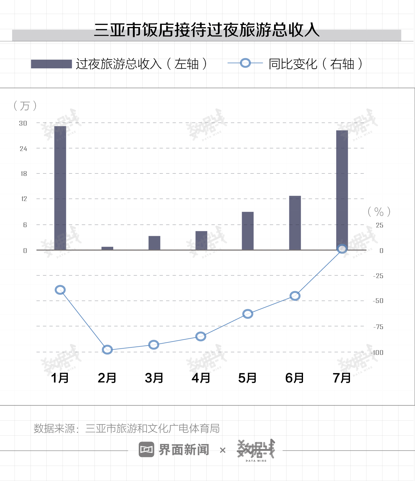 据三亚市旅游和文化广电体育局数据,今年2月,三亚市的饭店接待过夜游客数量受疫情影响,同比下降了95.63%,但到了7月份,同比下降幅度已经缩小为5.43%。三亚市的过夜旅游总收入,在今年2月仅为0.74亿元,同比下降98.52%,到今年7月份,已经超出去年同期1个百分点。