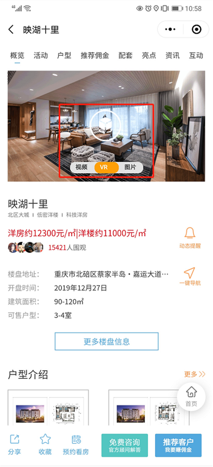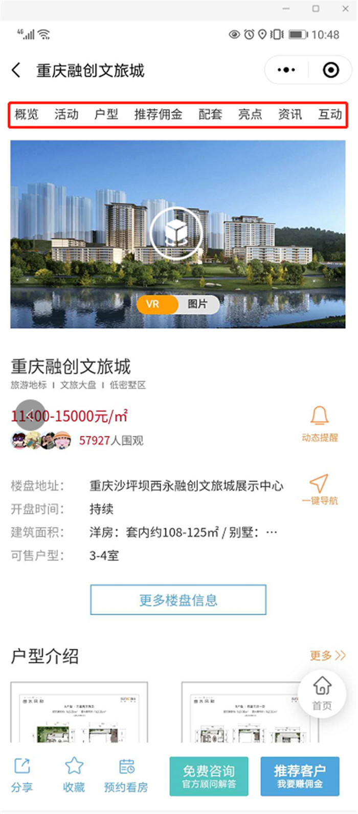 幸福通通过线上的个性化展厅,以图片、文字、相册、视频、VR等形式,全面展示楼盘的区位、周边配套、微沙盘、户型等价值点,让用户快速获取项目信息。同时,为增进用户与项目的互动交流,该平台还搭建起互动点评模块,活动,咨询、点评等可满足用户多样看房需求。