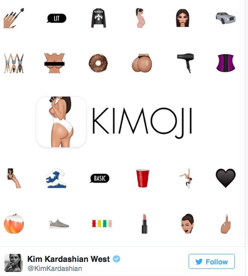 卡戴珊在自己的推特账号上发布了一组emoji表情包kimoji。在这组表情包里,不光有卡戴珊绝对标志性的“肥臀”和“巨乳”之外,还有以她怀孕作为表情的图案。当然这些都不是重点。卡戴珊的“钱商”也值得一提:所有她投资的美妆产品也都列入卡戴珊系的表情包当中。