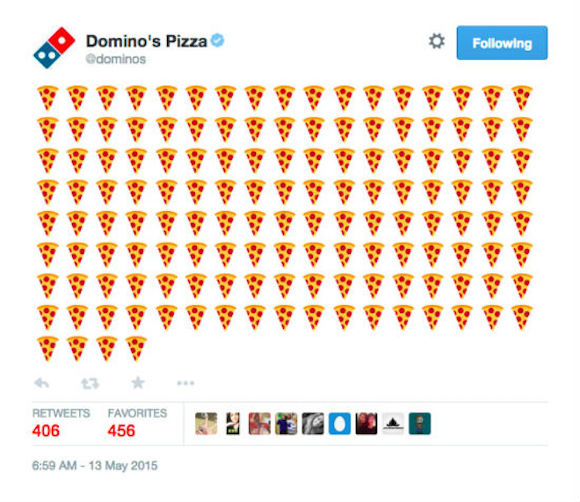 还有公司为emoji表情赋予了全新的功能。今年5月,美国达美乐(Dominos)披萨开通了“tweet-to-order”(推特点餐)系统,身处美国、且注册过达美乐账号和地址等信息的Twitter用户,可以直接在 Twitter上发个披萨的 Emoji 表情并@Dominos,之后就可以坐等外卖小哥送披萨上门了。
