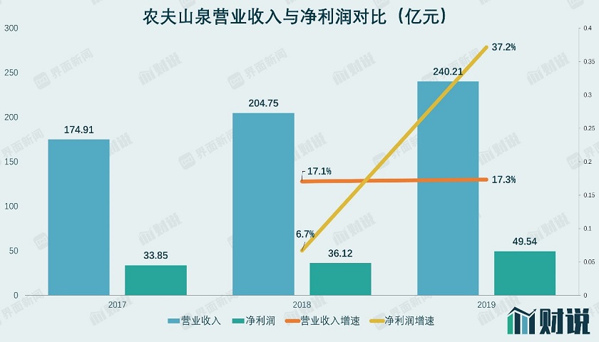 农夫山泉近三年来保持稳定增长。2017年到2019年,农夫山泉分别实现营收174亿元、204亿元以及240亿元,年复合增长率为17.2%;三年分别实现净利润33亿元、36亿元以及49亿元,净利润的年复合增长率为21.0%。这一增速高于同期中国软饮料行业5%左右的平均增速。