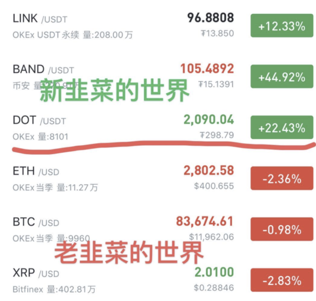 有人说,先进场的是老韭菜,后进场的是新韭菜。也有人说,买了“新币”(BAND、LINK等DeFi概念币)的是新韭菜,还持有“老币”(如比特币、以太币)的是老韭菜。